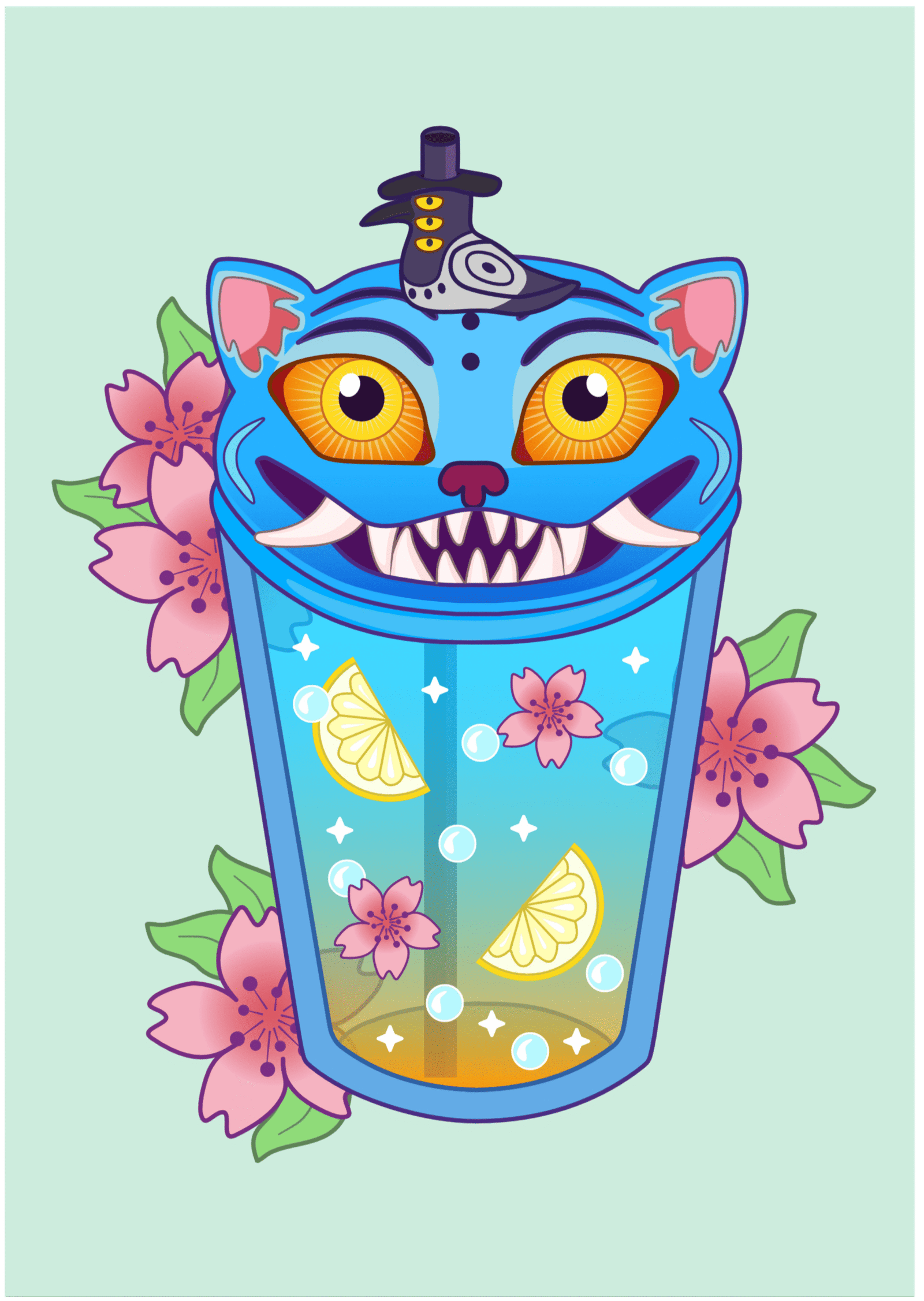 Tygrys z „KPOP Demon Hunters” w najbardziej niespodziewanej formie – jako egzotyczny napój! Szklanka pełna cytryn, kwiatów wiśni i bąbelków, a na wieczku czai się niepokojąco uroczy, niebieski tygrys. Idealny plakat dla fanów azjatyckiej estetyki, muzyki, fantastyki i nietypowych połączeń.